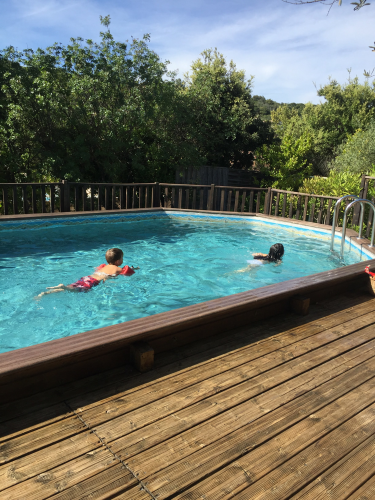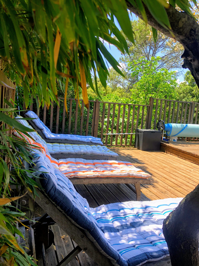 La piscine est sécurisée et est entourée d'une terrasse ombragée avec chaises longues. Les oliviers et la verdure qui l'entourent amènent à la sérénité. Comme on dit chez nous: «Vive le farniente !»