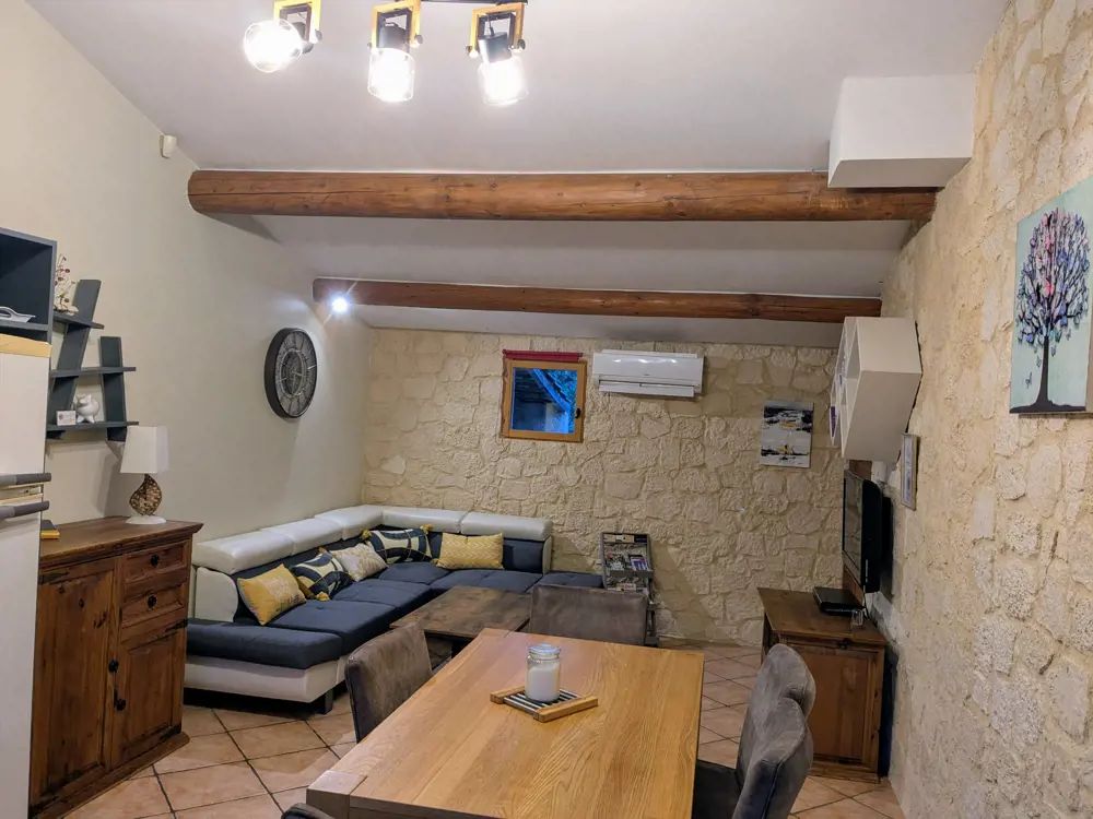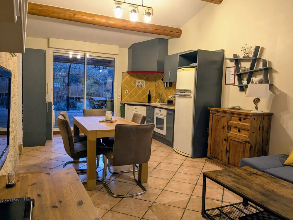 Le gîte des oliviers posséde une grande pièce à vivre climatisée, elle comprend salon et cuisine équipée ouverte sur une terrasse de 30m2 dans le jardin avec vue sur la piscine.